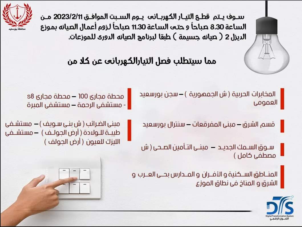كما أشارت محافظة بورسعيد بأنه أيضًا سيتم قطع التيار عن المناطق السكنية، والأفران، والمدارس الموزعه نطاق حي العرب وحي الشرق، والتي يشملها انقطاع الطياره الكهربائي.