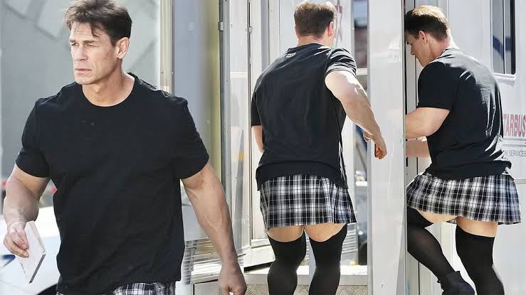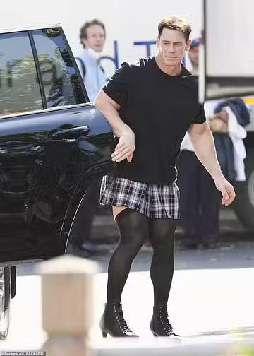 وظهر جون سينا البالغ من العمر 45 عامًا يرتدي جوارب نسائية تصل إلى الفخذين وتنورة قصيرة منقوشة ظهرت منها ساقاه ذات العضلات الضخمة بشكل لا يصدق يوم الخميس الماضي.