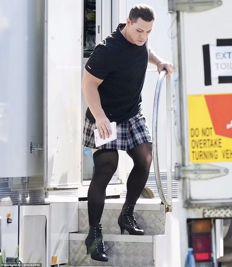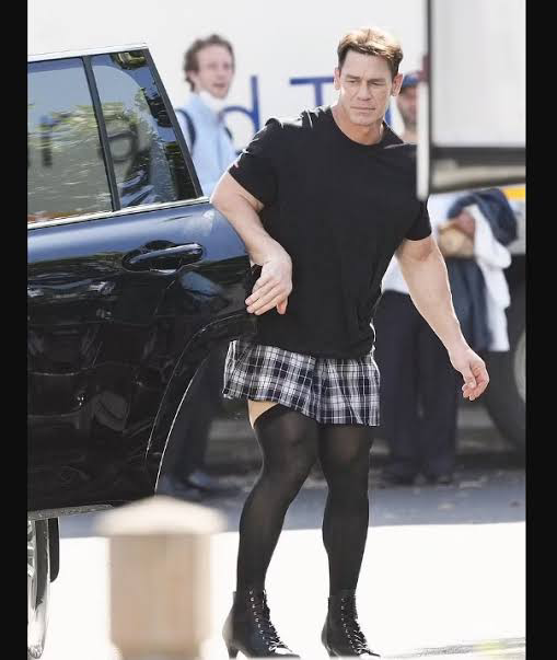 وأكمل جون سينا مظهره بزوج من الجوارب وحذاء ذي كعب عال، بينما صعد إلى مقر إقامته داخل مكان تصوير الفيلم بنفس الملابس.