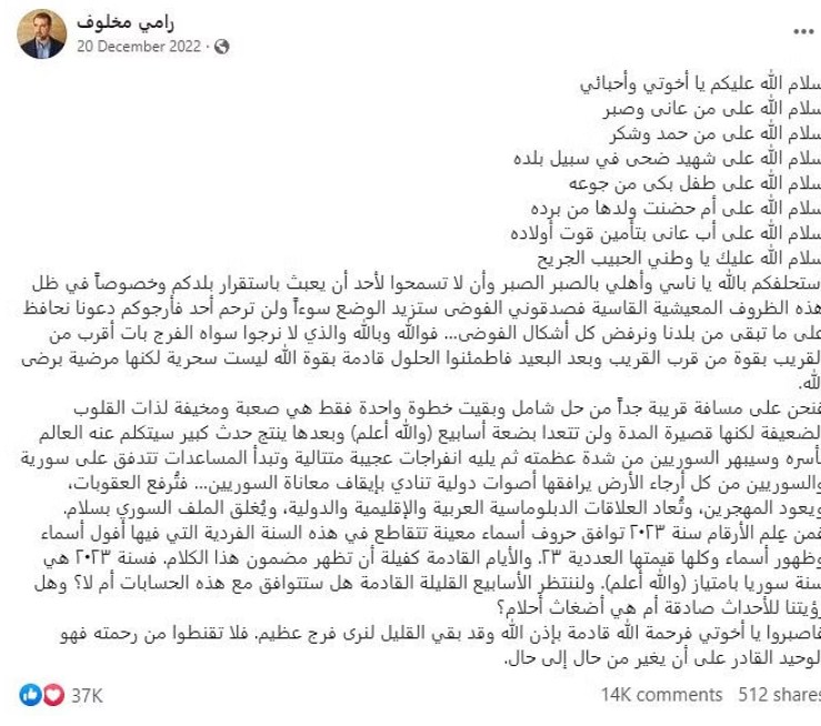 ويذكر أن رامي مخلوف نشر هذا المنشور على صفحته على فيس بوك في شهر ديسمبر الماضي، يتحدث عن حدث جلل سيصيب سوريا خلال الفترة المقبلة، ربطه البعض بزلزال تركيا وسوريا.