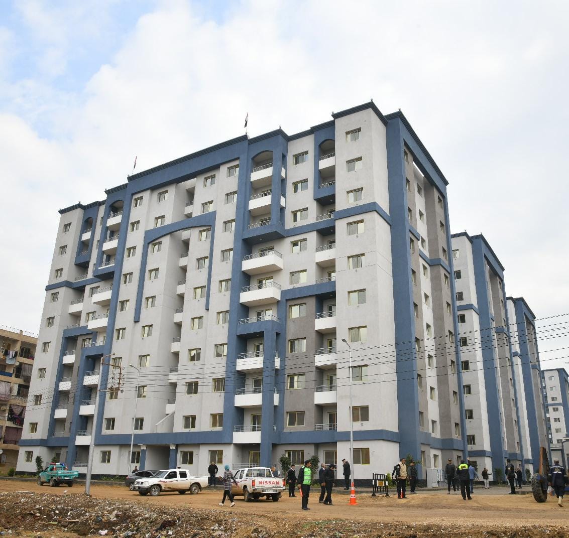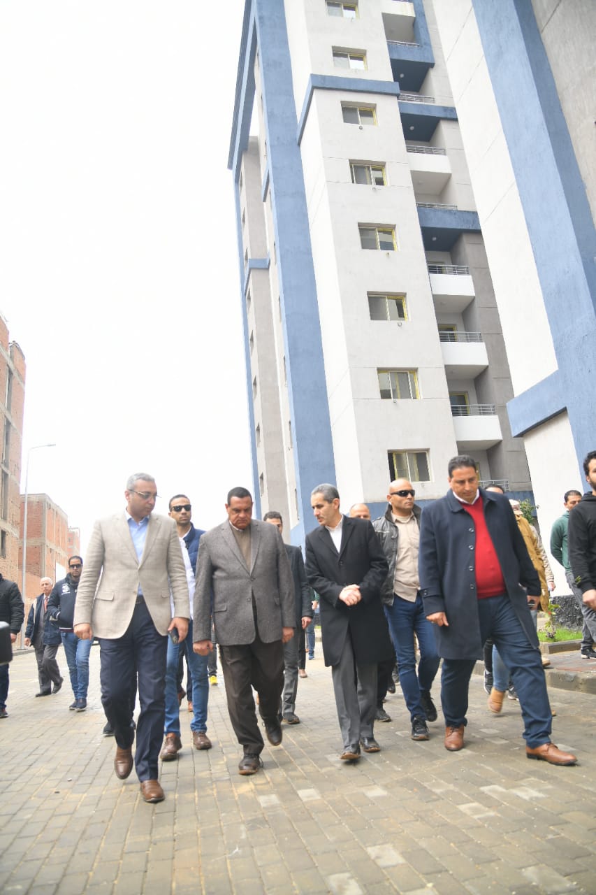 كما تفقد الوزير والمحافظ عدد من الشقق السكنية والبالغ عددها ٤٨٠ وحدة سكنية داخل ٦ عمارات مقامة على مساحة 2,3 فدان، وتتكون كل عمارة منهم من (دور أرضي و9 أدوار علوية).