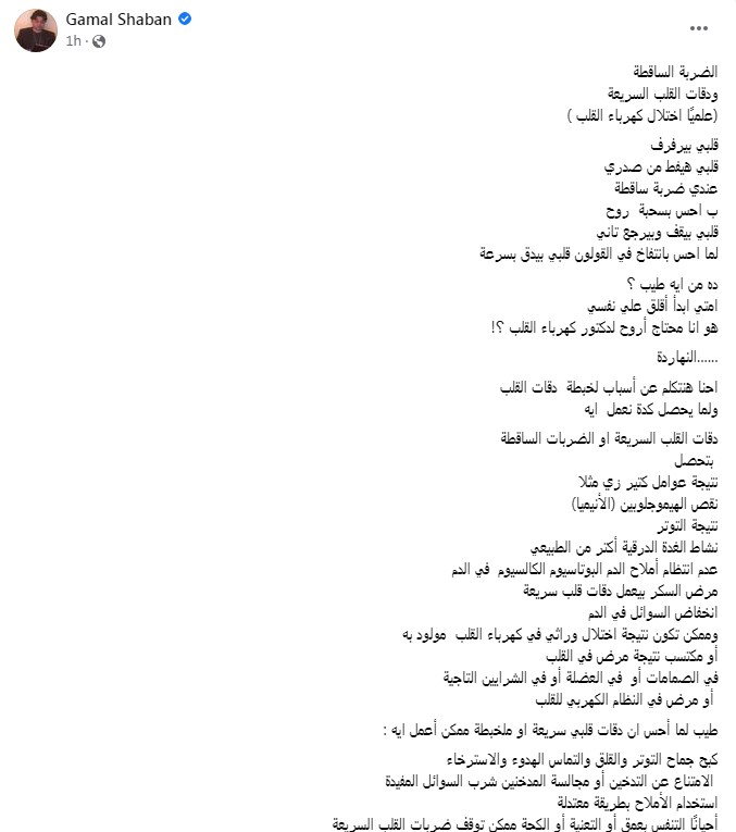وكشف الدكتور جمال شعبان عن سر دقات القلب السريعة فقال: "الضربة الساقطة ودقات القلب السريعة (علميًا اختلال كهرباء القلب).. قلبي بيرفرف قلبي هيفط من صدري، عندي ضربة ساقطة، باحس بسحبة روح، قلبي بيقف وبيرجع تاني"