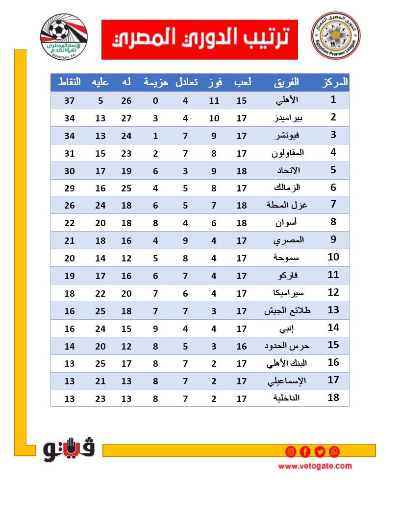 وجاء ترتيب الدوري المصري الممتاز كالتالي