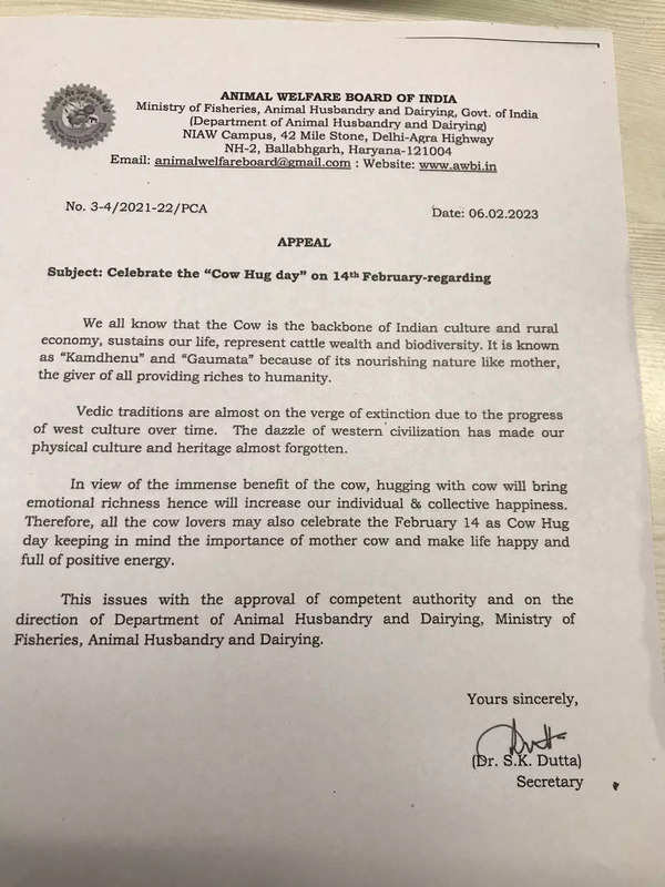أصدر مجلس رعاية الحيوان في الهند (AWCI) بيانًا يطلب من الناس الاحتفال بـ "يوم عناق البقرة" في 14 فبراير، حيث يزعمون أن القيام بذلك سيعزز "الثراء العاطفي" للاحتفال ويزيد من "السعادة الفردية والجماعية" من المشاركين، حسبما ذكر تقرير في صحيفة "هيندو".
