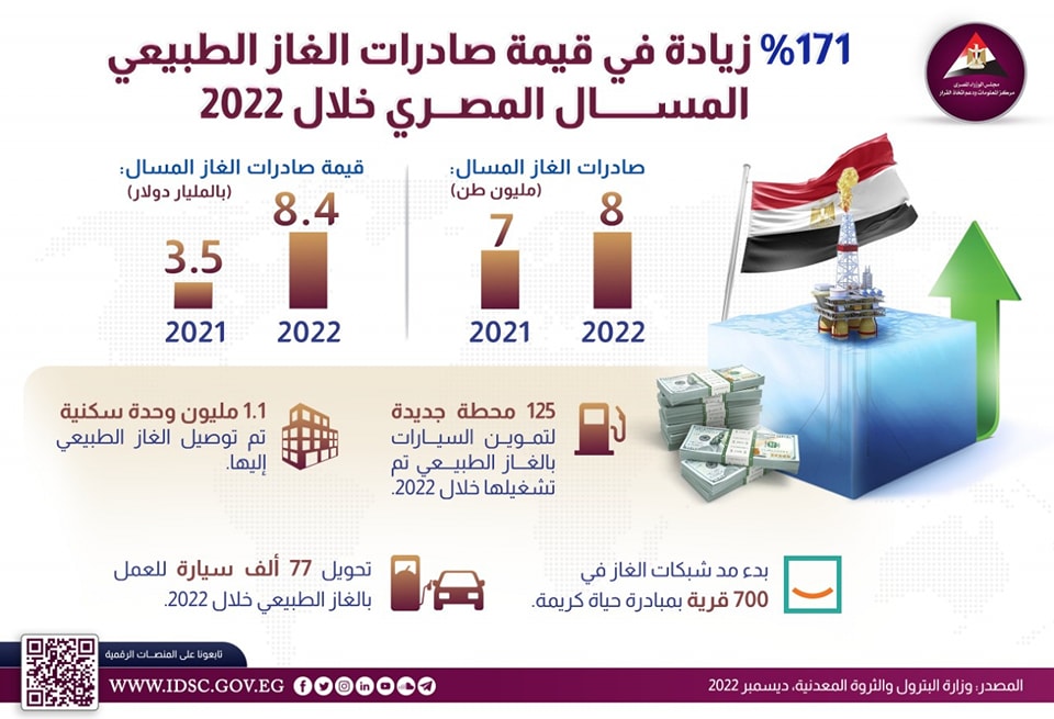نشر مركز المعلومات ودعم اتخاذ القرار بمجلس الوزراء إنفوجرافًا جديدًا عبر صفحته الرسمية على موقع التواصل الاجتماعي فيسبوك، تحت عنوان "171% زيادة في قيمة صادرات الغاز الطبيعي المسال المصري خلال عام 2022".