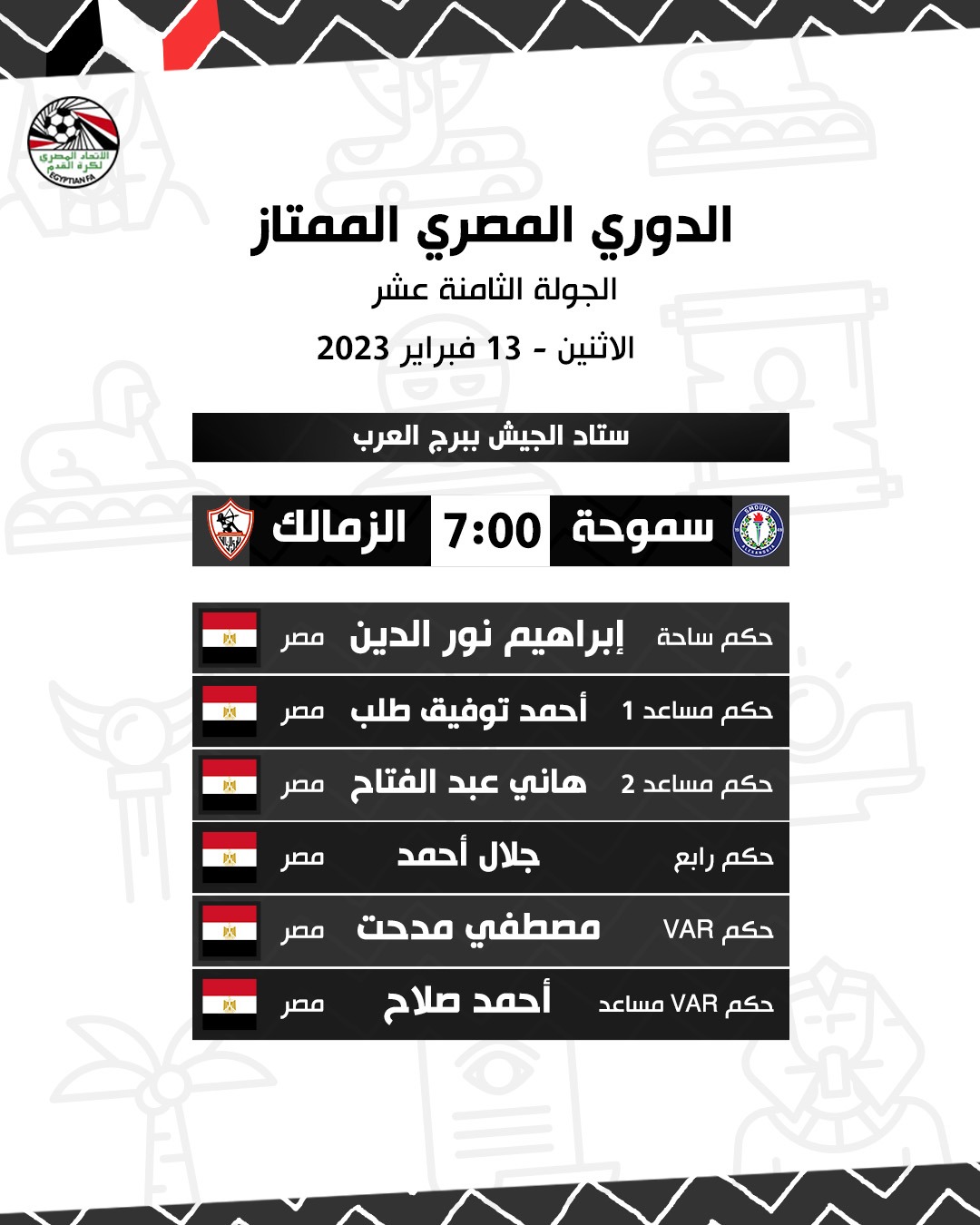 الدوري المصري، أعلنت لجنة الحكام الرئيسية باتحاد الكرة المصري، أسماء حكام مباراة سموحة أمام الزمالك غدا الاثنين، ضمن مواجهات الجولة 18 من الدوري المصري الممتاز.