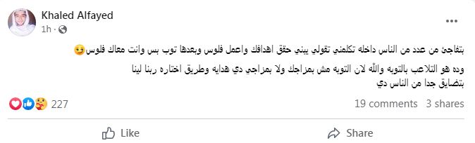 وكتب خالد الفايد قائلا: “بتفاجئ من عدد من الناس داخلة تكلمني تقول لي يا بني حقق أهدافك واعمل فلوس وبعدها توب بس وأنت معاك فلوس”.