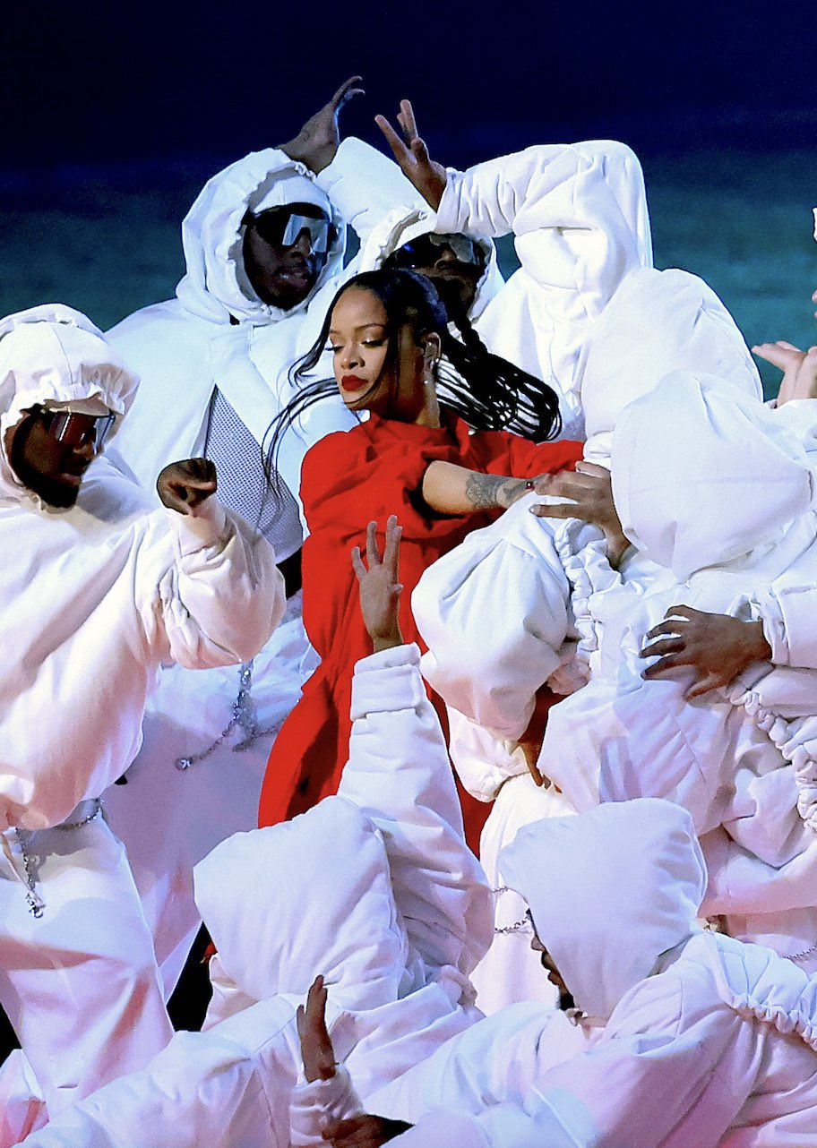 كما ظهرت ريهانا بملابس سوداء، بعد انتهاء حفل السوبر بول، وهي تحتفل بنجاح عرضها، وإعلان حملها الثاني.