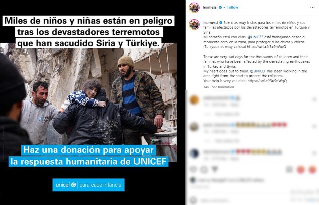 وعلق ميسي على المنشور باللغتين الإسبانية والإنجليزية: "هذه أيام حزينة للغاية لآلاف الأطفال وعائلاتهم الذين تضرروا من الزلازل المدمرة في تركيا وسوريا".