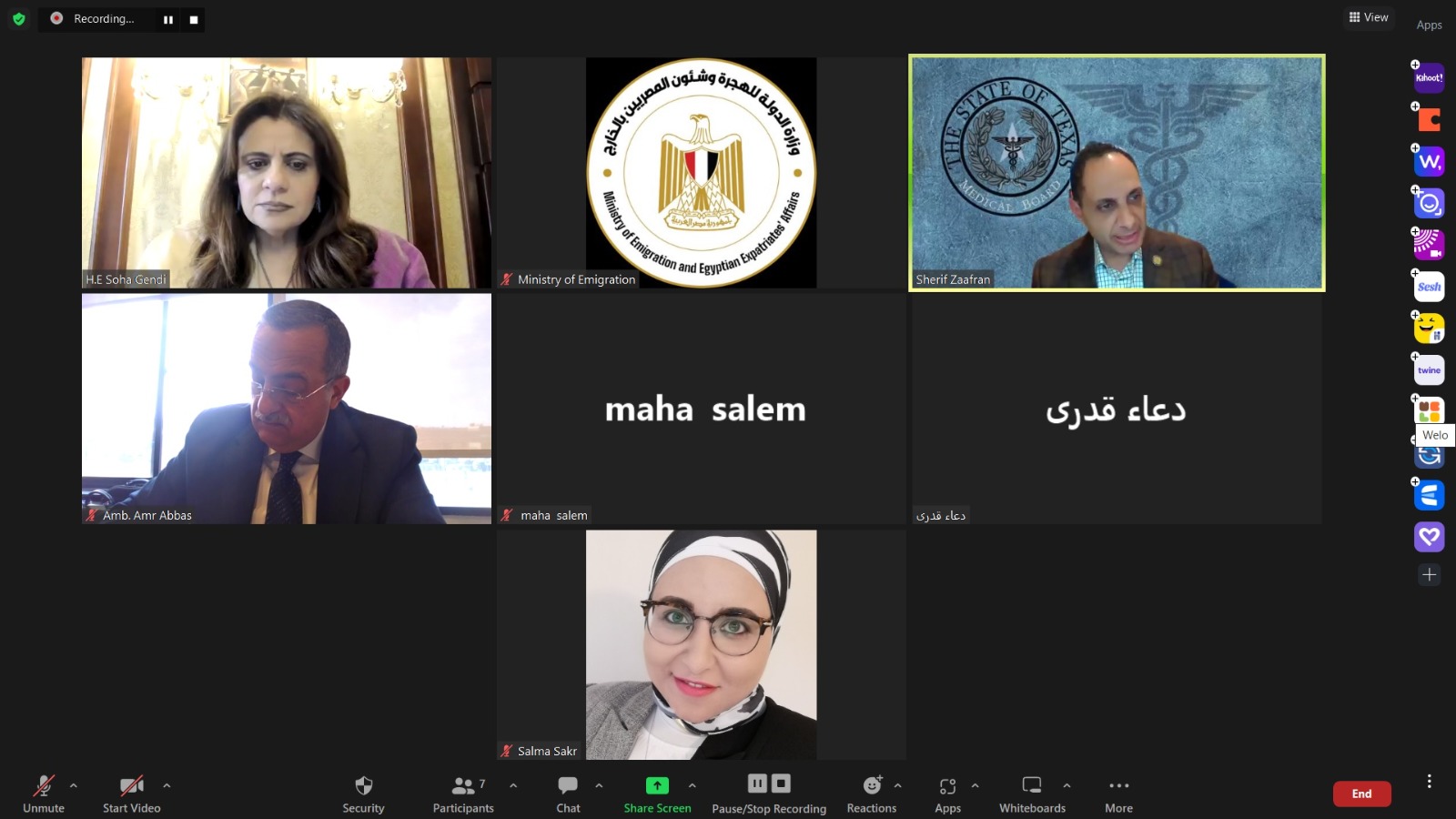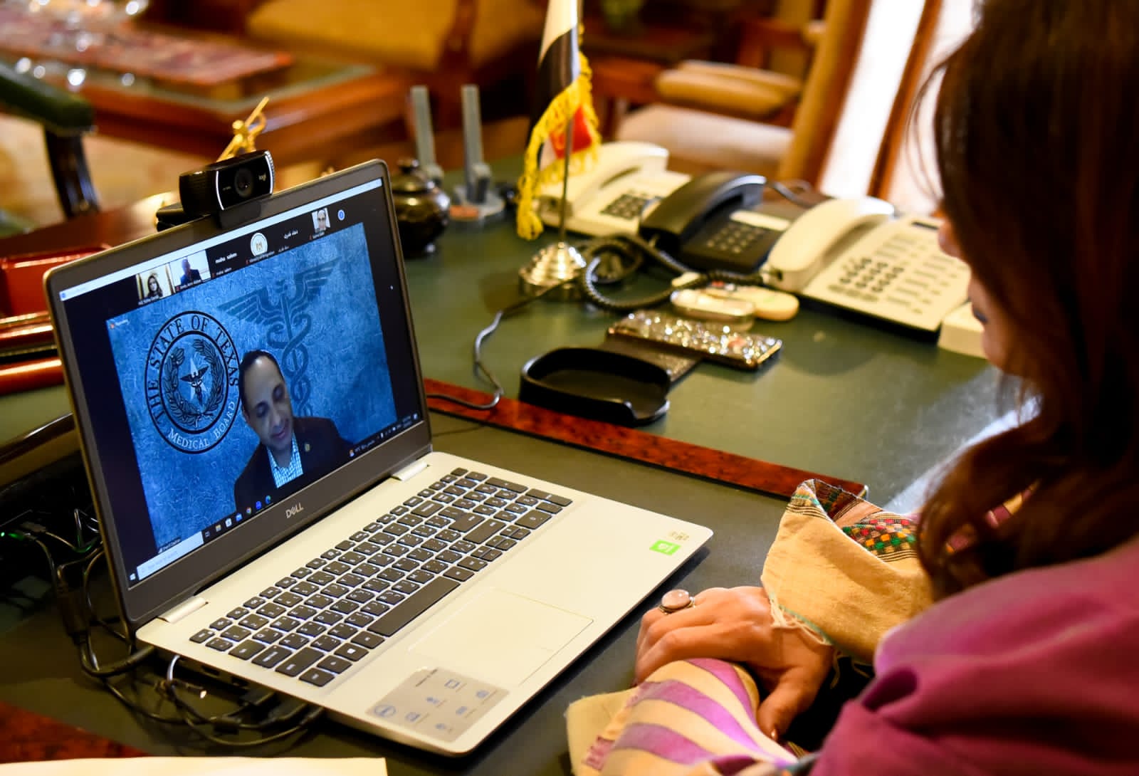 عقدت السفيرة سها جندي، وزيرة الدولة للهجرة وشئون المصريين بالخارج، لقاء افتراضيا عبر الفيديو كونفرانس، مع الدكتور شريف زعفران، رئيس المجلس الطبي بولاية تكساس الأمريكية، لبحث سبل التعاون وإدماج الخبراء المصريين بالخارج في جهود الدولة لتطوير القطاع الطبي في مصر ورعاية المواطنين المصريين بمختلف شرائحهم.