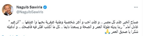 وعن عادل إمام كتب المهندس نجيب ساويرس عبر حسابه بتويتر: "صباح الخير على كل مصر.. وعلى أحب وأعز شخصية وطنية عبقرية بحبها واعشقها.. الزعيم عادل إمام ربنا يديله طولة العمر والصحة ويسعدنا دايما..".