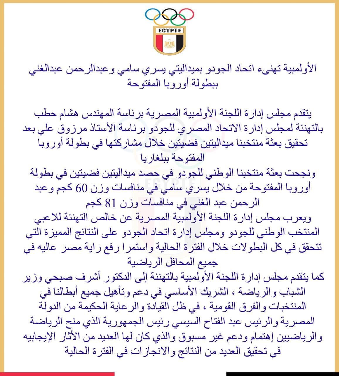 يتقدم مجلس إدارة اللجنة الأولمبية المصرية برئاسة المهندس هشام حطب بالتهنئة لمجلس إدارة الاتحاد المصري للجودو برئاسة الأستاذ مرزوق علي بعد تحقيق بعثة منتخبنا ميداليتين فضيتين خلال مشاركتها في بطولة أوروبا المفتوحة ببلغاريا.