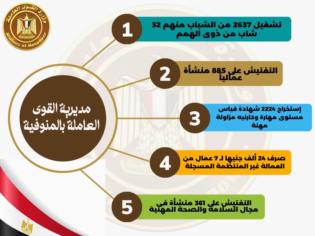وجاء في بيان صحفى للوزارة، اليوم الاثنين، أن التقرير الاول الذى تلقته الوزارة من سعد عبد الرحيم مدير مديرية القوى العاملة بالمنوفية بشأن نشاطها خلال الشهر، أوضح فيه ان المديرية قامت بصرف 24 ألف جنيها لـ 7 عمال من العمالة غير المنتظمة المسجلة بقاعدة بياناتها، كما قامت بالتفتيش الدورى من خلال أجهزة السلامة والصحة المهنية على 361 منشأة وتحرير 24 محضرًا للمنشآت المخالفة، و885 منشأة من خلال مكاتب التفتيش العمالى،اسفر عن تحرير 138 محضرًا، بالإضافة إلى تشغيل 2637 شاب من ابناء المحافظة منهم 32 شاب من ذوى الهمم والقدرات، واستخراج 2224 شهادة قياس مستوي مهارة ورخصة مزاولة مهنة من مكاتب التشغيل التابعة لها.