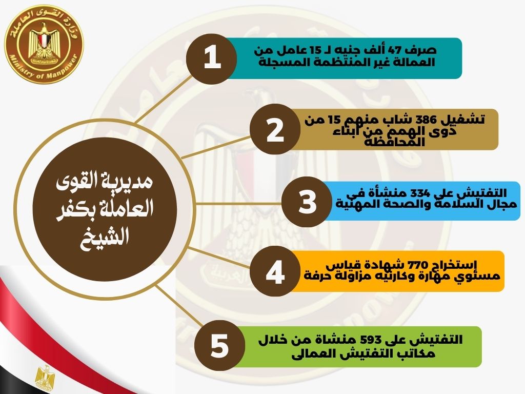 أما عن التقرير الثانى، نوه فيه حازم على حسن مدير مديرية القوى العاملة بكفر الشيخ ، إلى أن المديرية استطاعت خلال الشهر توفير 386 فرصة عمل للشباب منها 15 لذوى الهمم، والتفتيش على 593 منشاة بنظام الدورى والحملات،يعمل بها 6657 عاملًا واسفر عن تحرير 33 محضر، وكذلك التفتيش في مجال السلامة والصحة المهنية على 334 منشأة ، اسفر عن تحرير 25 محضرًا لمنشآت مخالفة، فضلًا عن صرف 47 ألف جنيه لـ 15 عاملًا من العمالة غير المنتظمة المسجلة بالمديرية لرعايتهم إجتماعيًا وصحيًا، فضلًا عن عقد 4 دورات تدريبية استفاد منها 49 متدرب ومتدربة، واستخراج 770 شهادة قياس مستوي مهارة وكارنيه مزاولة الحرفة .