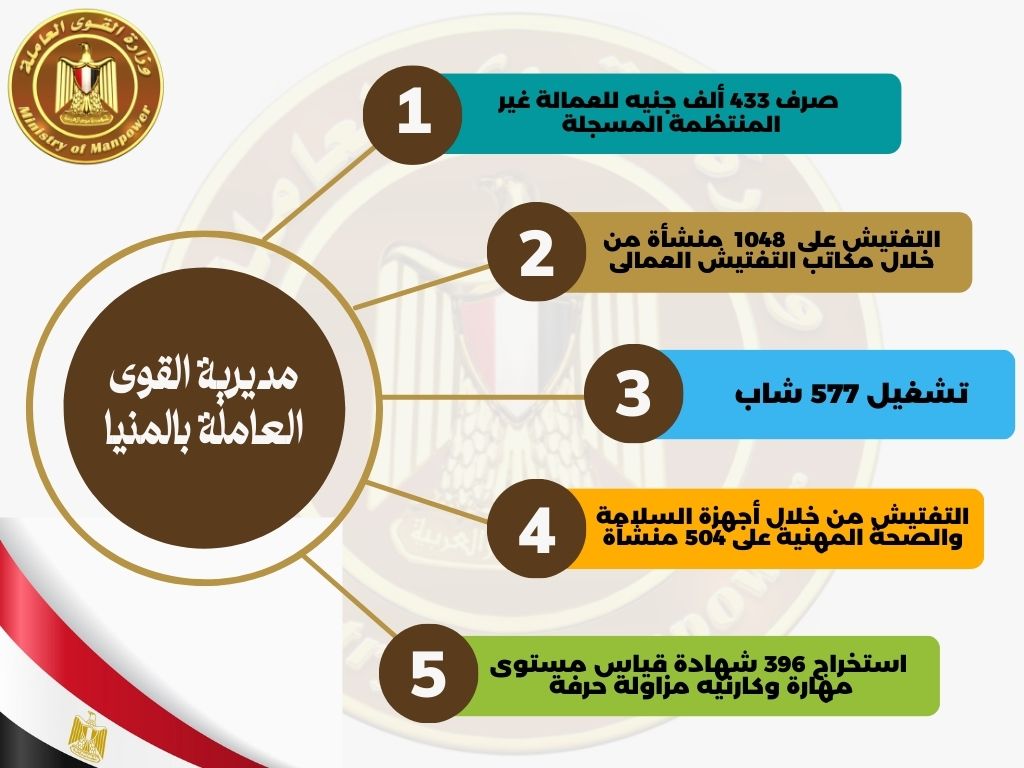 والتقرير الثالث قال فيه محمد صلاح محمد مدير مديرية القوى العاملة بالمنيا، انه تم تشغيل 577 شاب، واستخراج 396 شهادة قياس مستوى مهارة وكارنيه مزاولة حرفة، والتفتيش على 1048 منشأة عماليًا يعمل بها 3080 عاملًا، واسفر عن تحرير 78 محضرًا، وبحث 35 شكوى عمالية، والتفتيش على 504 منشأة فى مجال السلامة والصحة المهنية واسفر عن تحرير 144 محضرًا للمنشآت المخالفة، وعقد 24 ندوة توعية في نفس المجال، فضلًا عن صرف 433 ألف جنيه لـ 5546 عاملًا من العمالة غير المنتظمة المسجلة بالمديرية لرعايتهم إجتماعيًا وصحيًا .