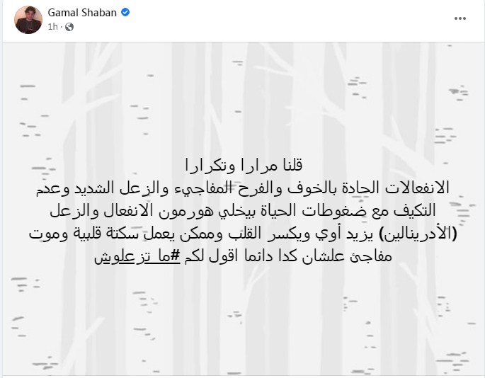 وأشار الدكتور جمال شعبان، عبر حسابه بالفيس بوك، إلى السكتة القلبية والموت المفاجئ فقال: "قلنا مرارا وتكرارا.. الانفعالات الحادة بالخوف والفرح المفاجيء والزعل الشديد وعدم التكيف مع ضغوطات الحياة بيخلي هورمون الانفعال والزعل (الأدرينالين) يزيد أوي ويكسر القلب وممكن يعمل سكتة قلبية وموت مفاجئ علشان كدا دائما اقول لكم #ما_تزعلوش"