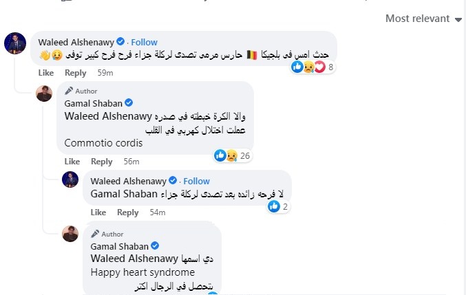وعلق أحد المتابعين مؤكدًا وفاة حارس مرمى في إحدى الفرق في بلجيكا بسبب السكتة القلبية والموت المفاجئ، فقال: "حدث امس فى بلجيكا.. حارس مرمى تصدى لركلة جزاء فرح فرح كبير توفى"