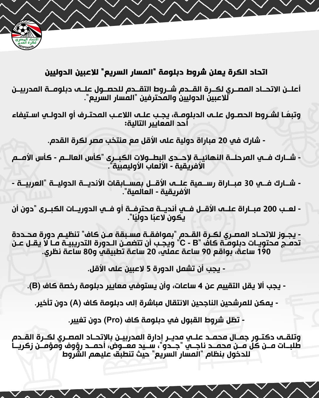 اتحاد الكرة، أعلن الاتحاد المصري لكرة القدم شروط التقدم للحصول على دبلومة المدربين للاعبين الدوليين والمحترفين "المسار السريع".
