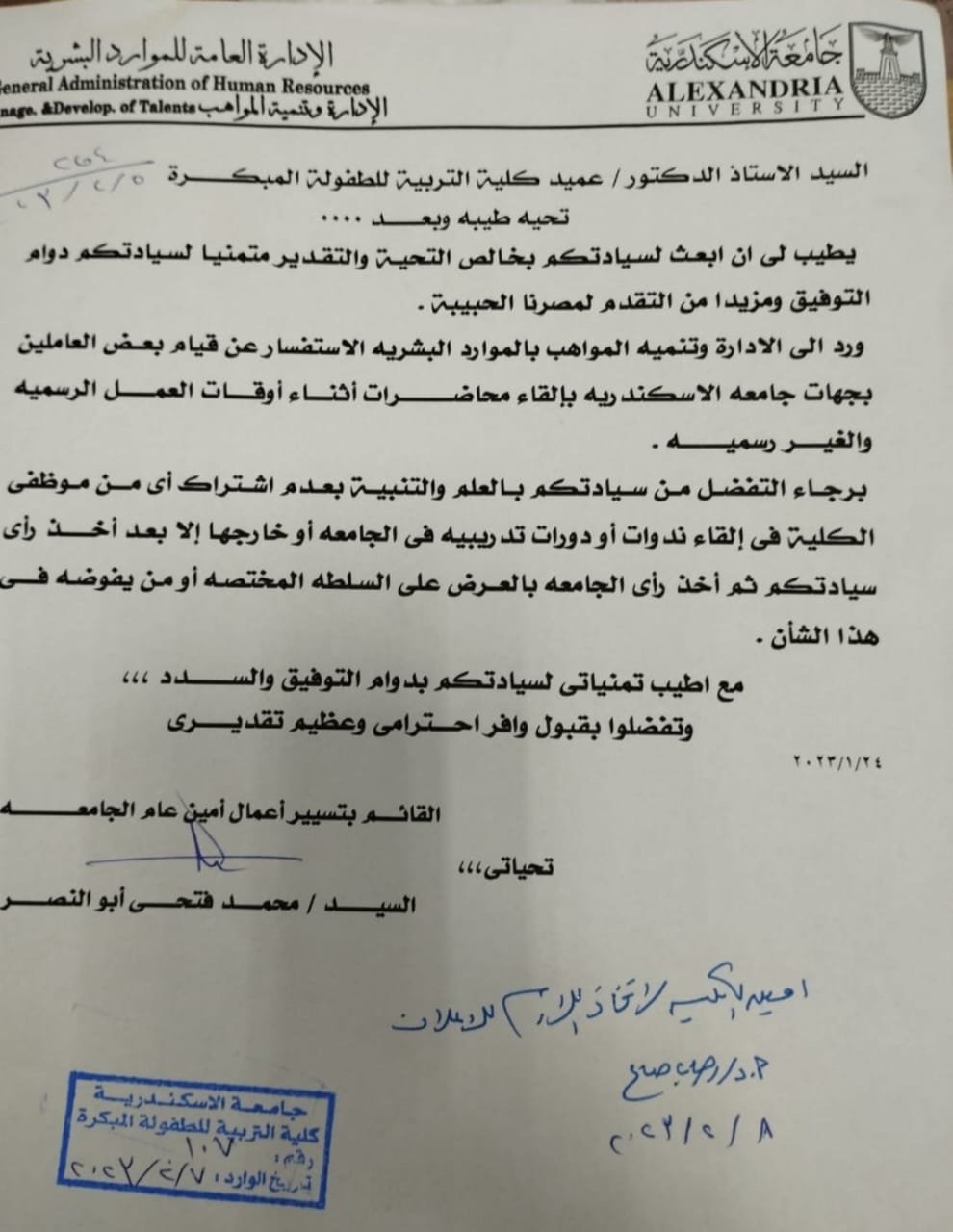 وجاء قرار أمين جامعة الإسكندرية، الموجه إلى عميد كلية التربية والطفولة المبكرة تحديدا، كالتالي: أنه ورد إلى إدارة تنمية المواهب بالموارد البشرية استفسار عن قيام بعض العاملين بجهات جامعة الإسكندرية بإلقاء محاضرات أثناء أوقات العمل الرسمية والغير رسمية.
