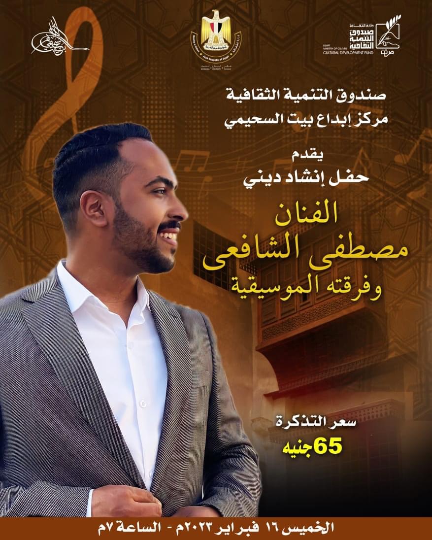 يستضيف مركز إبداع بيت السحيمي بشارع المعز، والتابع لقطاع صندوق التنمية الثقافية، حفل إنشاد ديني للفنان مصطفى الشافعي وفرقته الموسيقية، في السابعة مساء الخميس المقبل الموافق 16 فبراير الجاري.