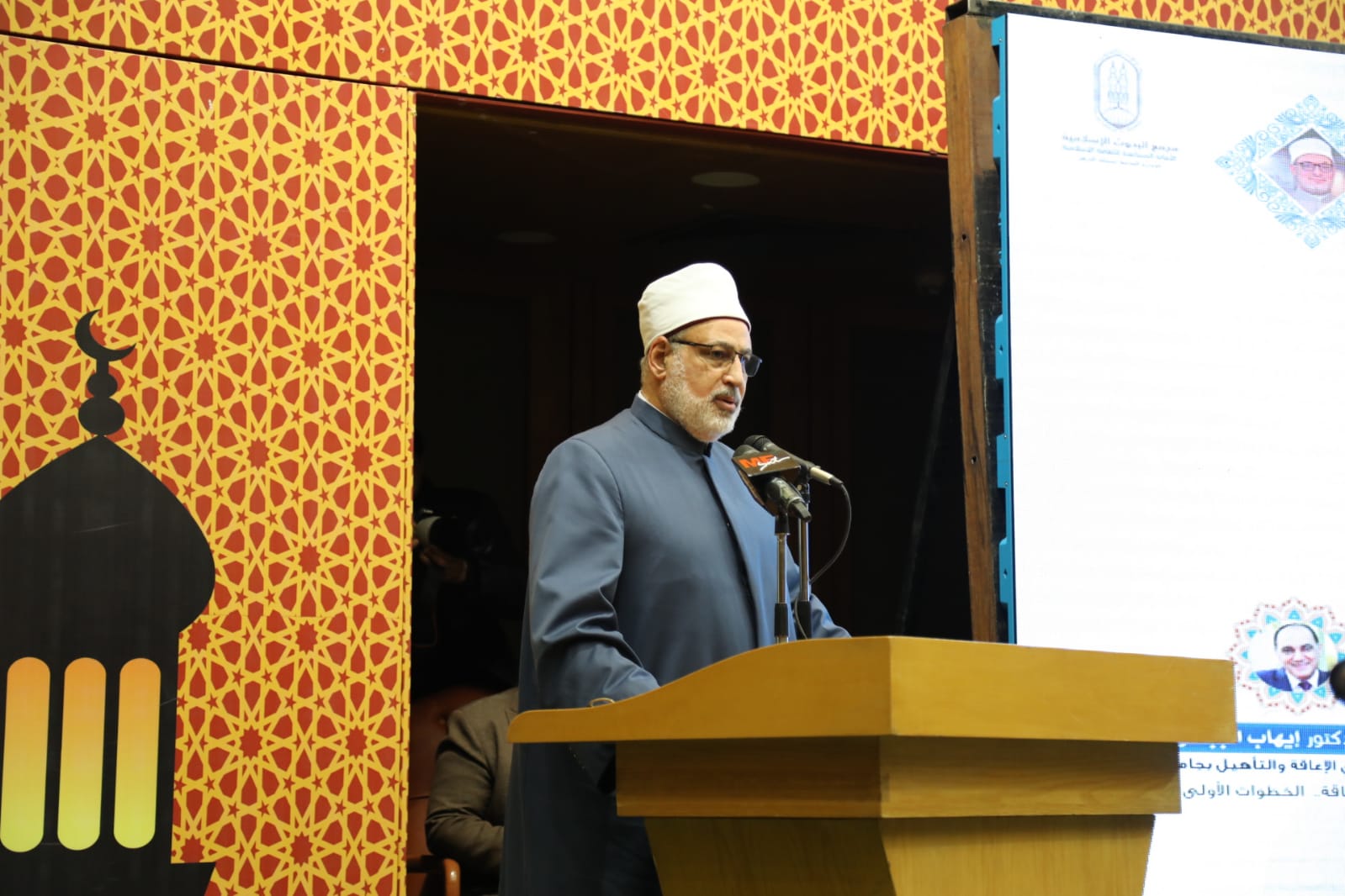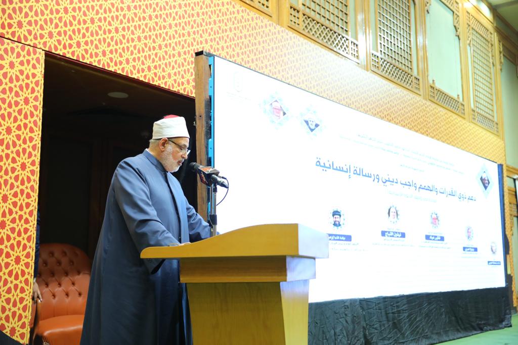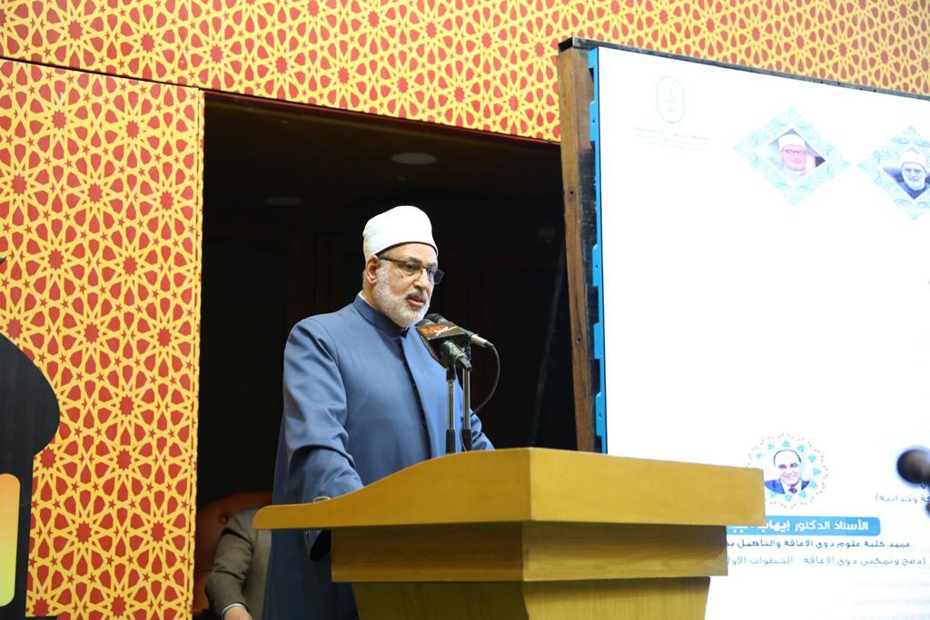 وبين فضيلته أن ديننا الإسلامي ضرب أروع الأمثلة في توفير الرعاية الكاملة لذوي الهمم، والعمل على قضاء حوائجهم، وجعل لهم الأولوية في التمتع بكافة الحقوق التي يحصل عليها غيرهم دون تمييز، فقد عاتب الله سيدنا محمد ﷺ في سورة عبس بشأن عبد الله بن أم مكتوم، وهو (كريم العينين)، في انصرافه عنه وانشغاله بدعوة وجهاء قريش، ورغم أن عبد الله بن أم مكتوم لم ير انصرافه عنه إلا أن الله عاتب النبي بآيات تتلى إلى أن يرث الله الأرض ومن عليها، وهو النموذج الفريد في الرحمة والتعاطف والإنسانية، مع أن النبي لم ينشغل عنه لهوى في نفسه، وإنما شغلته دعوة رجال من قريش في إسلامهم مصلحة كثير من المسلمين! لكن كأنه إعلان رباني أن ذوي الهمم لا يقلون عن غيرهم، وأن رعايتهم والعناية بهم وتقديم الخدمات لهم مبدأ إسلامي مهم من مبادئ وقيم الإسلام العظيمة الخالدة، ويذكر هنا أن النبي كان بعد هذه الحادثة يبسط رداءه لابن أم مكتوم ويقول مداعبا: أهلا بمن عاتبني فيه ربي.