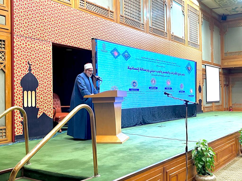 وأضاف فضيلته أن الازهر لم يكتف بذلك بل أنشأ صندوق للتكافل الاجتماعي بالجامعة، خاص بالطلاب والطالبات ذوي القدرات الفائقة، يوفر لهم كل ما يحتاجونه من أجهزة تعويضية أو دراجات مجهزة، أو أي أدوات تيسر لهم تحدي الإعاقة، كما عقد العديد من الدورات لتأهيل الطلاب وتعليمهم القراءة والكتابة بطريقة «برايل» في المرحلة قبل الجامعية، والتي كان آخرها بالتعاون مع مؤسسة أخبار اليوم، كما عقد شراكة مع وزارة التضامن لتوفير بطاقة الرعاية الشاملة التي تعطيهم الكثير من الميزات، فضلا عن توفير الأجهزة التعويضية للمحتاجين وصرف إعانة شهرية لهم من بيت الزكاة والصدقات المصري الذي يشرف عليه فضيلة الإمام الأكبر شيخ الأزهر.