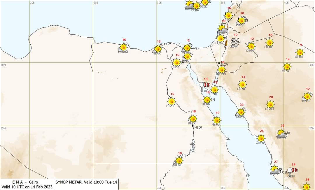 كما توقعت هيئة الأرصاد الجوية أن يكون الطقس اليوم على جنوب سيناء مائل للدفء على جنوب سيناء وجنوب الصعيد، كما توقعت أن يسود اليوم طقس بارد ليلًا على شمال البلاد حتى القاهرة الكبرى وشديد البرودة على جنوب البلاد.