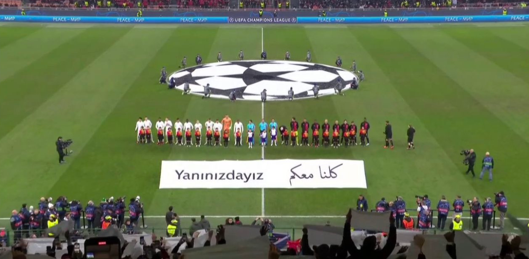 لافتة دعم لضحايا زلزال تركيا وسوريا بالعربية قبل انطلاق مباريات دوري أبطال أوروبا (صور)