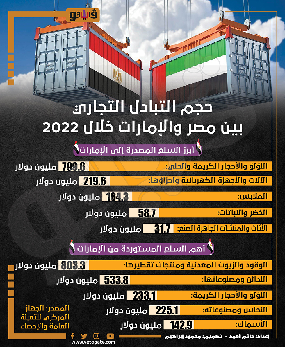 حجم التبادل التجاري بين مصر والإمارات خلال 2022 (إنفوجراف) الخميس 16/فبراير/2023 - 01:54 م 2/16/2023 1:54:53 PM الصادرات المصرية، فيتو حاتم أحمد شارك طباعة 18 حجم الخط شارك طباعة الإمارات اللؤلؤ والأحجار الكريمة الجهاز المركزى للتعبئة العامة والإحصاء النحاس الوقود والزيوت المعدنية الاجهزة الكهربائية