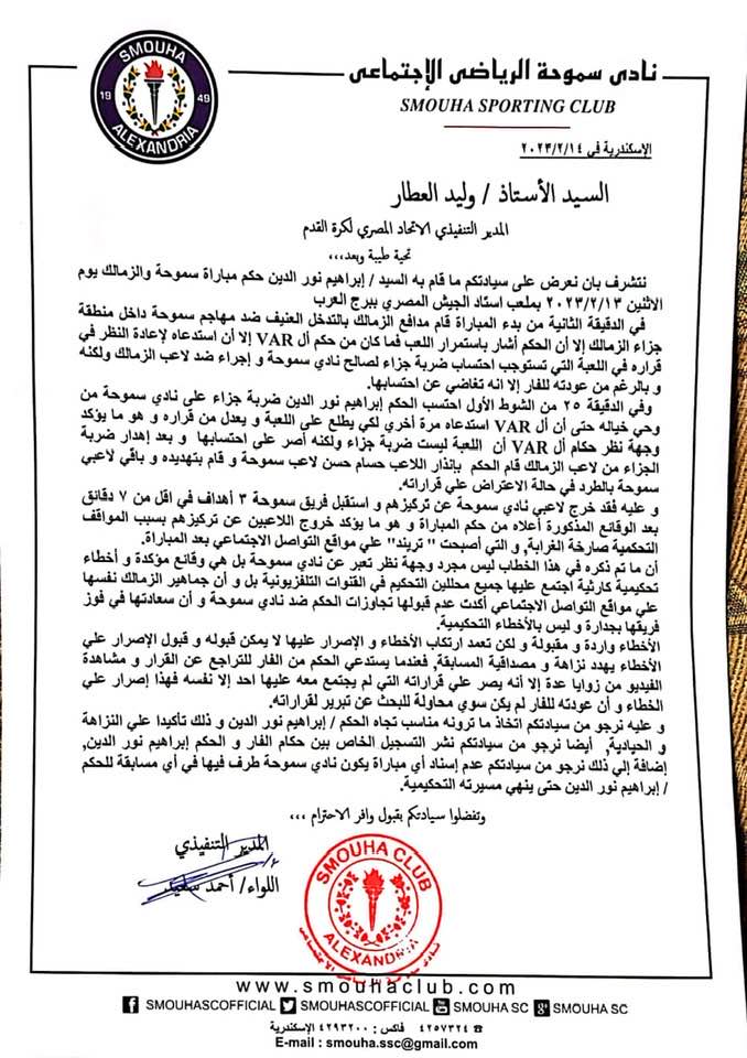 وجاء في خطاب نادي سموحة، طلب اتخاذ الإجراءات اللازمة للحفاظ على النزاهة والحيادية، وذلك على خلفية الحالات الجدلية التي شهدتها مباراة الفريق السكندري أمام الزمالك، وخسرها سموحة بـ3 أهداف.