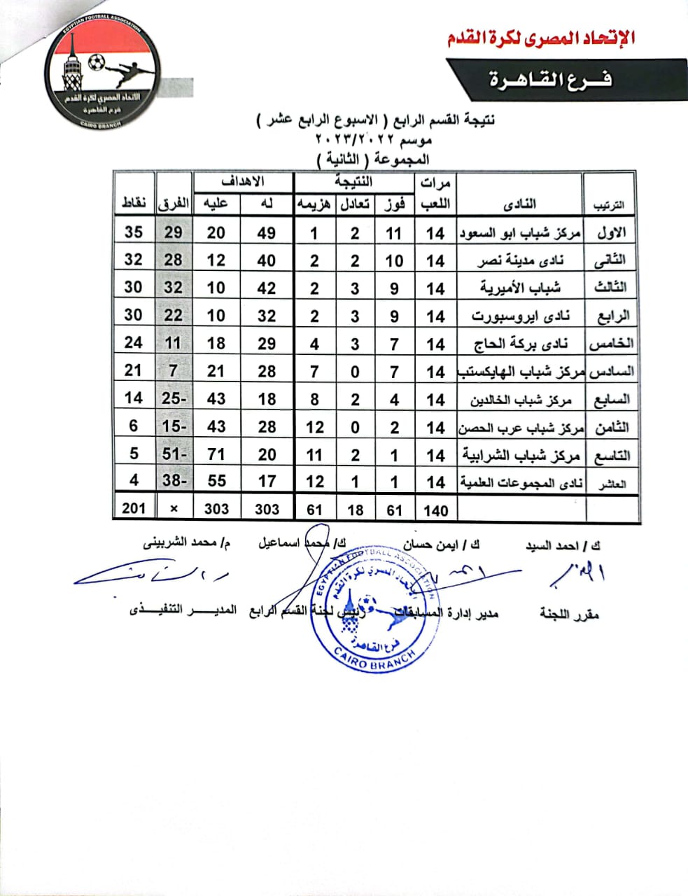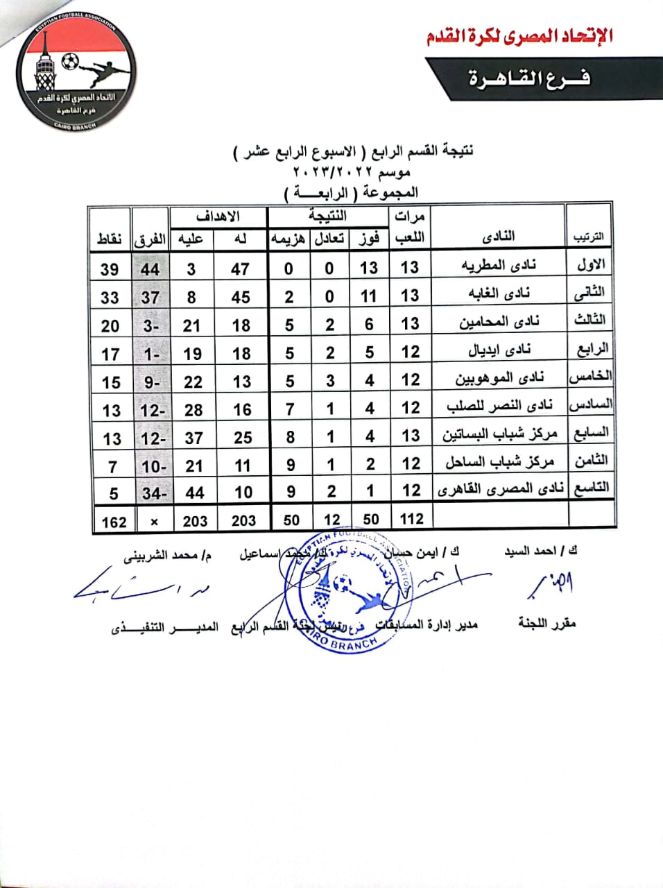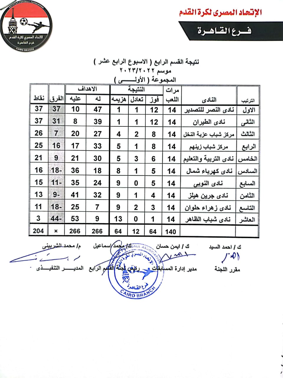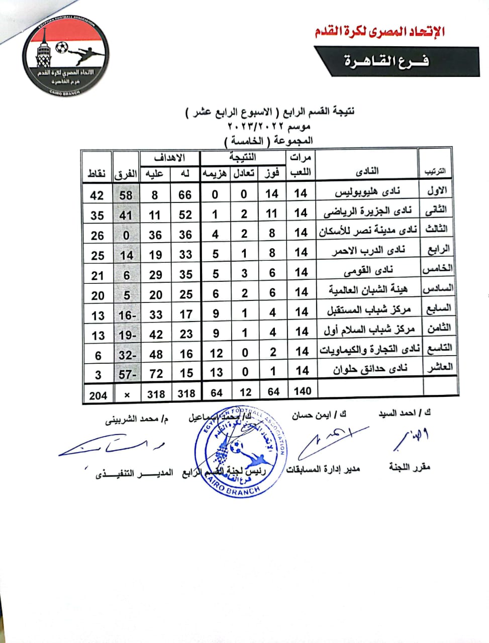 اعتمدت منطقة القاهرة لكرة القدم بقيادة الكابتن حمادة الشربيني، ولجنة مسابقات دوري القسم الرابع بقيادة محمد اسماعيل، وأيمن حسان مدير إدارة المسابقات وأحمد السيد مقرر لجنة مسابقات القسم الرابع جدول ترتيب المجموعات الخمسة حتي الآن.