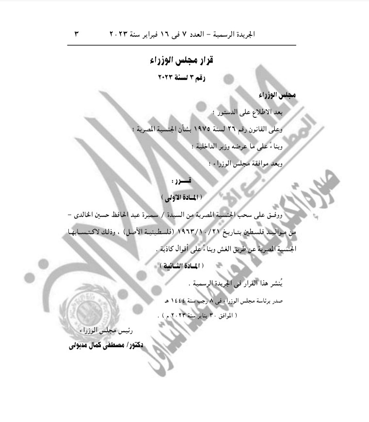 -قرار مجلس الوزراء رقم 3 لسنة 2023، بالموافقة على سحب الجنسية المصرية من سميرة عبد الحافظ حسين الخالدي، من مواليد فلسطين 1963 فلسطينية الأصل، وذلك لاكتسابها الجنسية المصرية عن طريق الغش وبناءً على أقوال كاذبة.