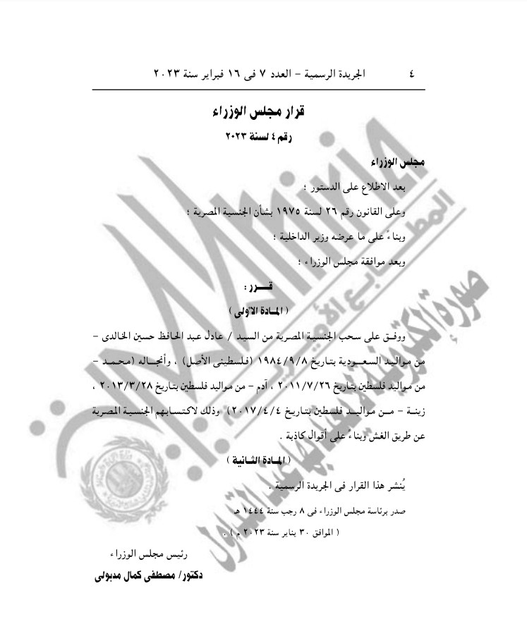 -قرار مجلس الوزراء رقم 4 لسنة 2023، بالموافقة على سحب الجنسية المصرية من عادل عبد الحافظ حسين الخالدي، من مواليد السعودية 1984 فلسطيني الأصل، وأنجاله وذلك لاكتسابهم الجنسية المصرية عن طريق الغش وبناءً على أقوال كاذبة.