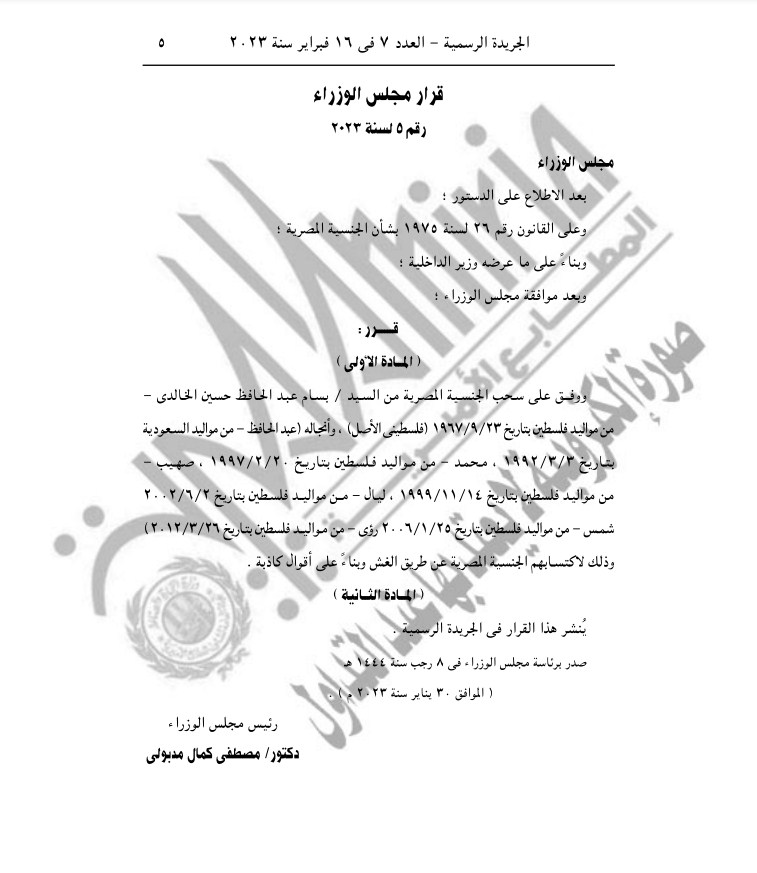 -قرار مجلس الوزراء رقم 5 لسنة 2023، بالموافقة على سحب الجنسية المصرية من بسام عبد الحافظ حسين الخالدي، من مواليد فلسطين 1967 فلسطيني الأصل، وأنجاله وذلك لاكتسابهم الجنسية المصرية عن طريق الغش وبناءً على أقوال كاذبة.