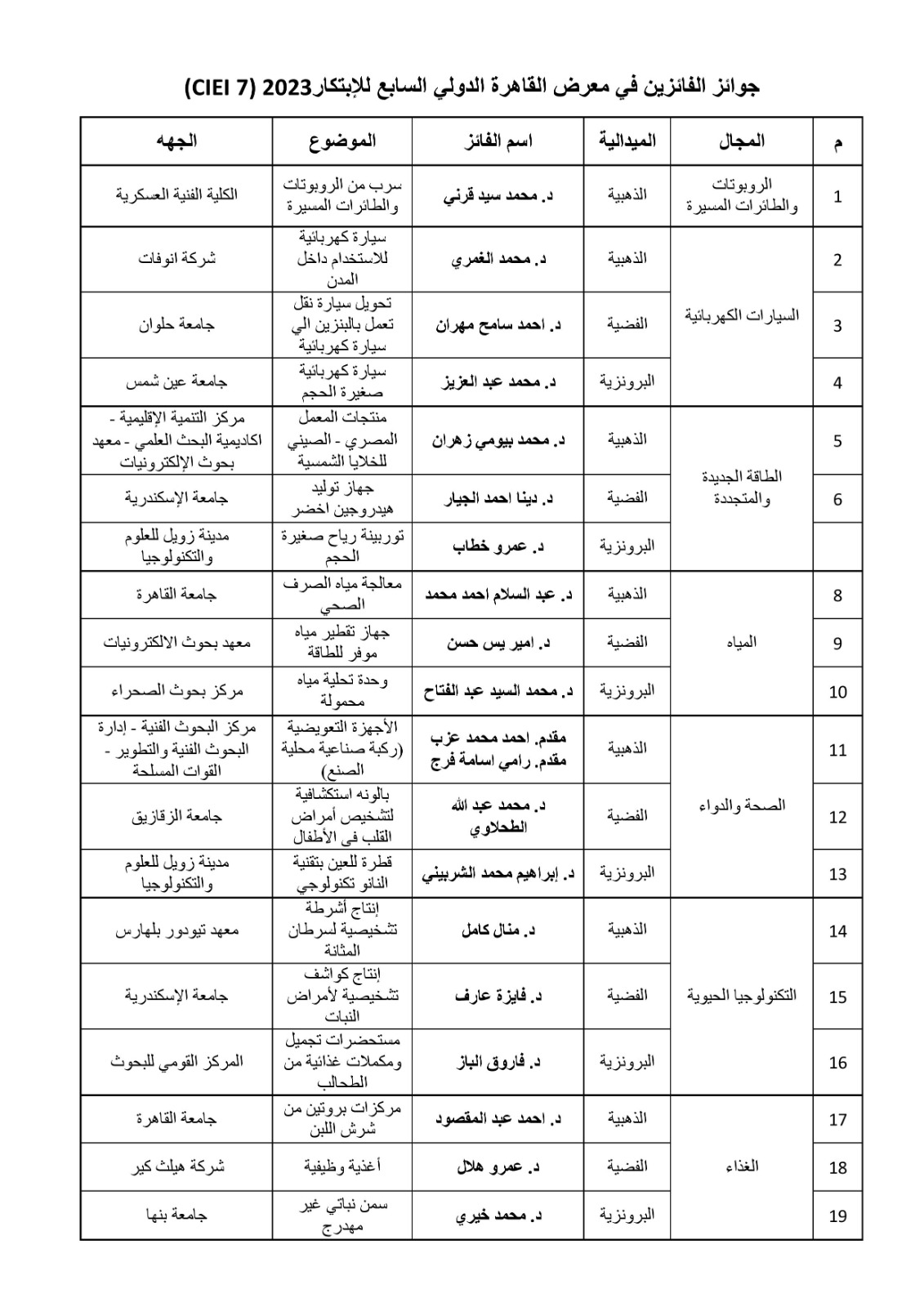 وننشر لكم فيما يأتي جداول الفائزين بجوائز معرض القاهرة الدولي السابع للابتكار 2023: