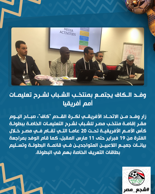 زار وفد من الاتحاد الأفريقي لكرة القدم "كاف"، صباح اليوم مقر إقامة منتخب مصر للشباب لشرح التعليمات الخاصة ببطولة كأس الأمم الأفريقية تحت 20 عاما التي تقام في مصر خلال الفترة من 19 فبراير حتى 11 مارس المقبل، كما قام الوفد بمراجعة بيانات جميع اللاعبين المتواجدين في قائمة البطولة وتسليم بطاقات التعريف الخاصة بهم في البطولة.