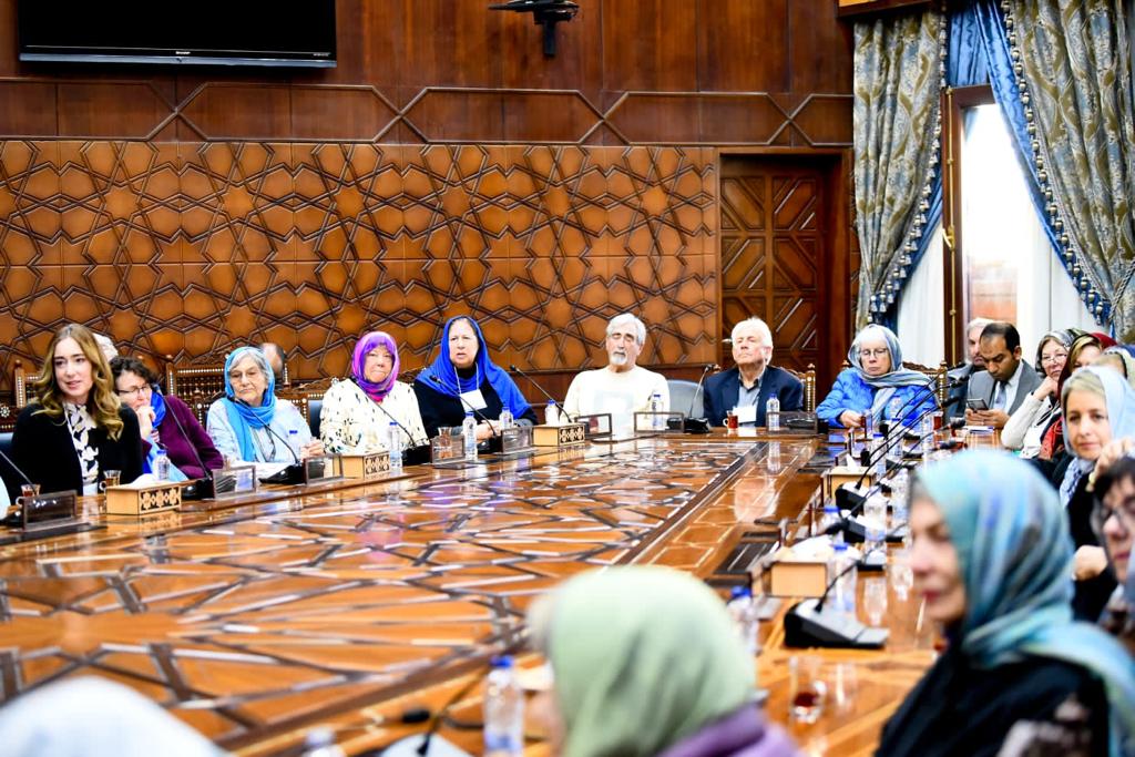 في بداية اللقاء، عبر فضيلة الإمام الأكبر عن ترحيب الأزهر الشريف وعلماؤه، بهذه النخبة التي تسعى إلى ترسيخ مبادئ العدل والمساواة حول العالم، مؤكدا أن السلام والحوار وقبول الآخر هو شغله الشاغل، وكان ذلك هو الأساس الذي قامت عليه الجهود المشتركة بيننا وبين البابا فرنسيس، والذي اكتشفت أنه رجل إنسانية من الطراز الرفيع، وقد قادنا التقارب في الرؤى إلى صنع وثيقة الأخوة الإنسانية، التي استغرقت عاما كاملا من العمل الدؤوب، لتخرج للعالم في شكلها الحالي ولتكن بمثابة "وثيقة عالمية" تؤسس لسلام عالمي حقيقي وعالم ينعم فيه الجميع بالتفاهم والتسامح والعيش المشترك.