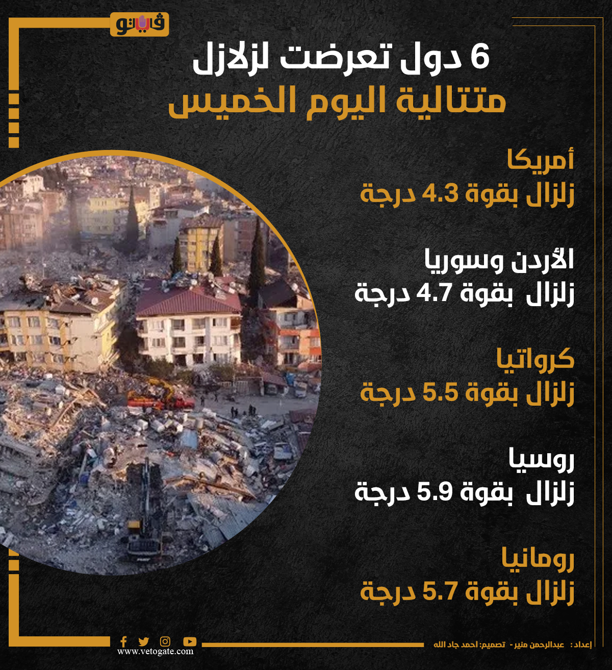 6 دول تعرضت لزلازل متتالية اليوم الخميس (إنفوجراف) الخميس 16/فبراير/2023 - 07:39 م 2/16/2023 7:39:41 PM زلزال مدمر، فيتو عبدالرحمن منير شارك طباعة 18 حجم الخط شارك طباعة زلزال اليوم زلزال تركيا وسوريا زلزال سوريا و الأردن زلزال روسيا أمريك رومانيا كرواتيا