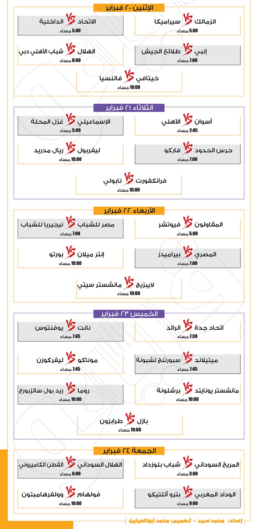مباريات الأسبوع، الأهلي مع الهلال السوداني وقمة ليفربول ضد ريال مدريد (إنفوجراف) الجمعة 17/فبراير/2023 - 05:12 م 2/17/2023 5:12:25 PM ريال مدريد ضد ليفربول، فيتو محمد سيد شارك طباعة 18 حجم الخط شارك طباعة الأهلي الزمالك الهلال السودانى ليفربول ريال مدريد برشلونة مانشستر يونايتد