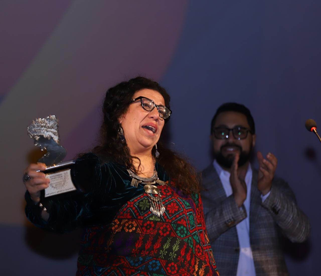 وتسلمت الممثلة المصرية سماء إبراهيم، درع هيباتيا الذهبي تكريما لعطائها المستمر على مدار مشوارها الفني ودعمها للأفلام القصيرة.