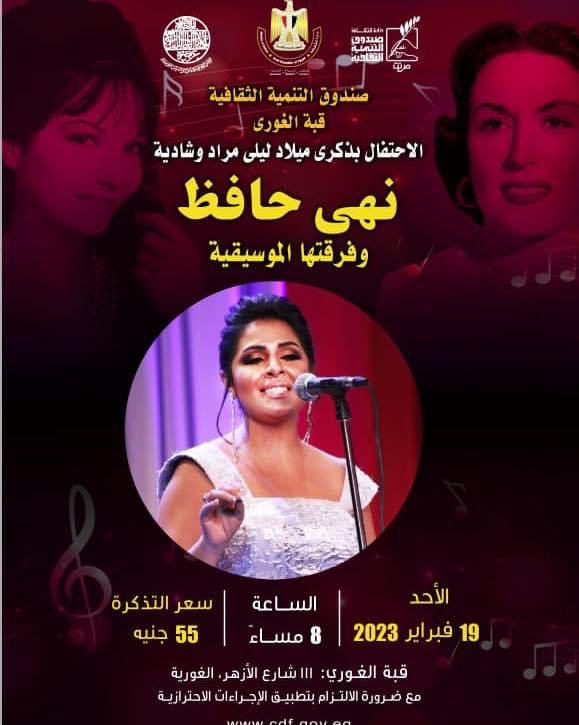 يستضيف مركز إبداع قبة الغورى بشارع الأزهر، التابع لقطاع صندوق التنمية الثقافية، حفل غنائي للمطربة نهى حافظ، وذلك في الثامنة من مساء الأحد المقبل الموافق 19 فبراير الجاري.