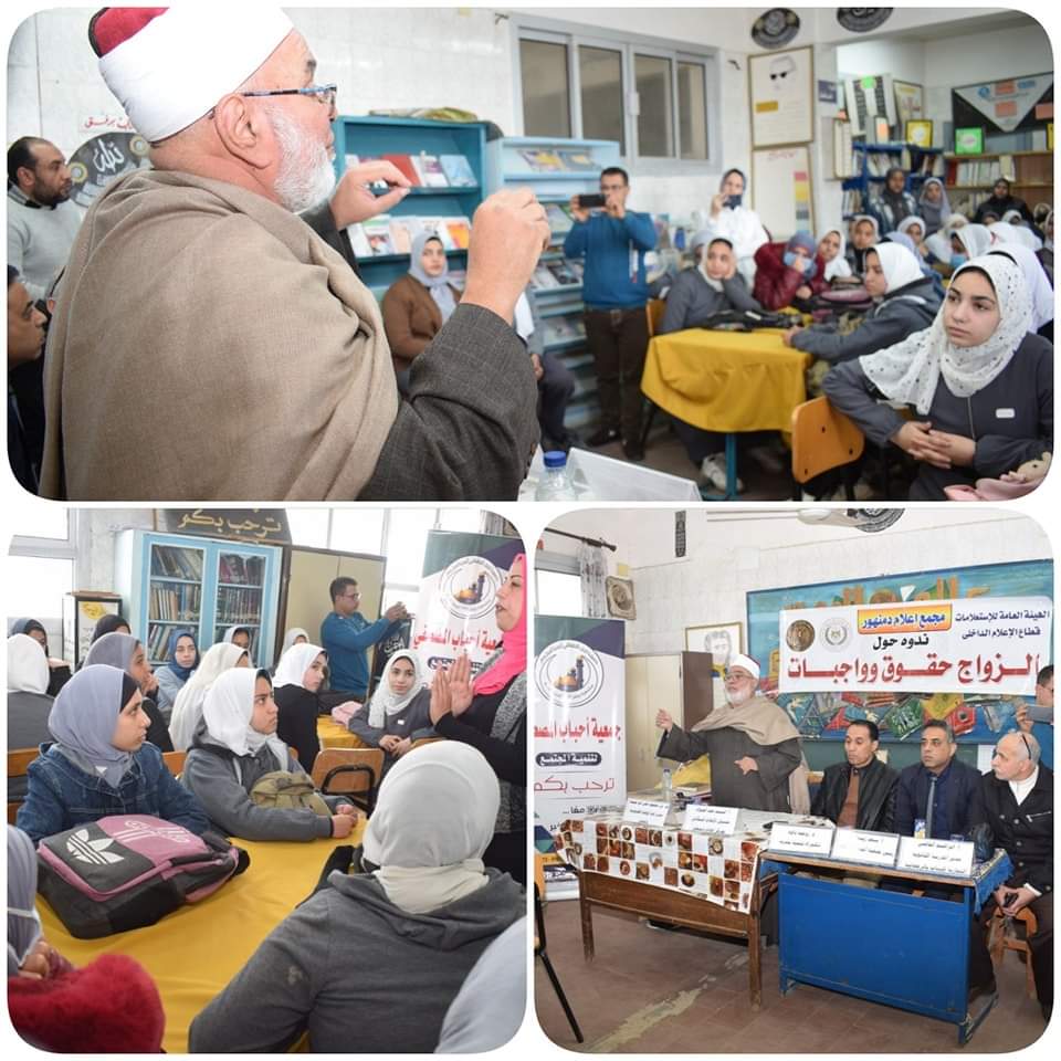 كما نظم أمس مركز إعلام دمنهور برئاسة الأستاذة أميرة الحناوي بالتعاون مع مديرية التربية والتعليم وإدارة أوقاف الرحمانية وجمعية أحباب المصطفى لتنمية المجتمع ندوة توعوية حول "الزواج حقوق وواجبات" بالمدرسة الثانوية التجارية بنات بالرحمانية ويأتي ذلك تحت رعاية الدكتورة نهال بلبع نائب محافظ البحيرة.