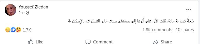 وكان يوسف زيدان كتب عبر حسابه الشخصي على موقع التواصل الاجتماعي "فيس بوك" في الساعات الأولى من صباح اليوم السبت قائلا: "ذبحةٌ صدرية حادة، نُقلت الآن على أثرها إلى مستشفى سيدي جابر العسكري، بالإسكندرية".