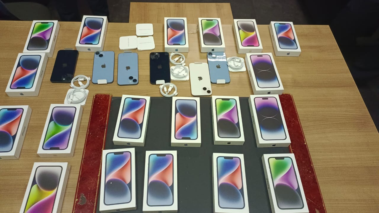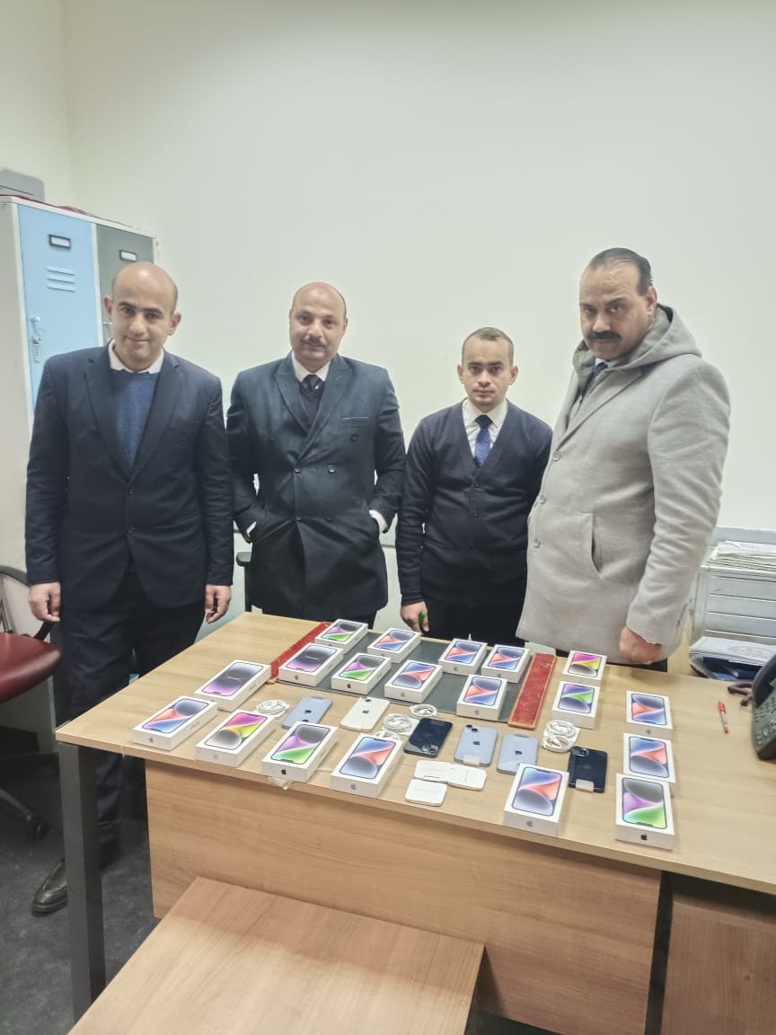 وبعرض الأمر علي فتحي فوزي مدير الجمرك، كلف محمد يوسف وهيثم محمد مأمورا الجمرك، بتفتيش المستقبل ذاتيا مما أسفر عن ضبط عدد كبير من التليفونات المحمولة خبأهم المستقبل داخل جيوب البالطو، وتم تكليف ولاء محمد فرغلي مأمور الجمرك، بتفتيش الراكبتين ذاتيا فتبين وجود هاتفين مخبأين علي جسد راكبه وخمس كراتين هواتف فارغة علي جسد الراكبة الثانية، ليبلغ إجمالي المضبوطات ٢٠ هاتف محمول ماركة iPhone 14 pro.