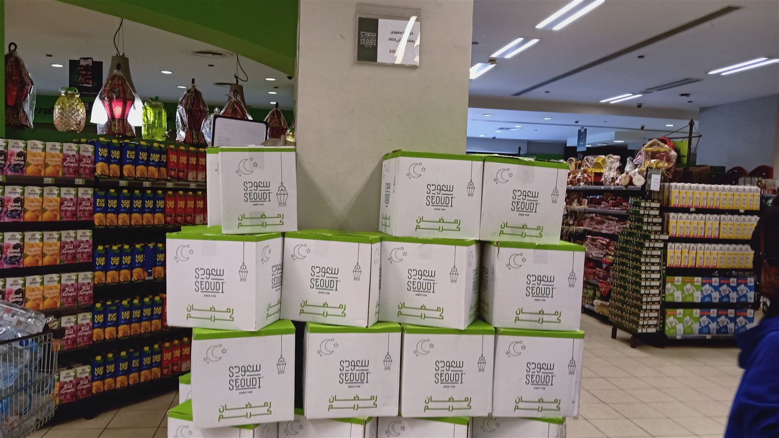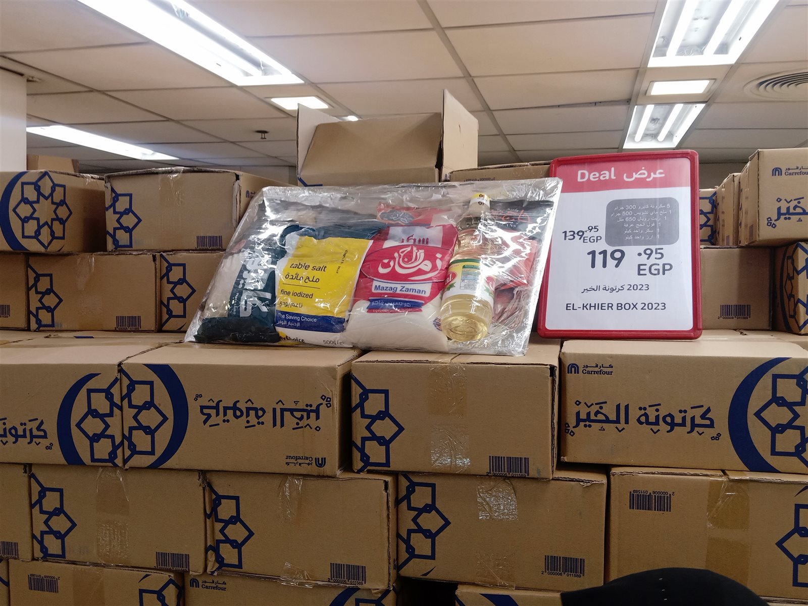 كما عرضت عدد من المحال التجارية الكبرى ما يعرف بكرتونة رمضان وهي كرتونة تحتوي على عدد من السلع الأساسية مثل الأرز والسكر المكرونة والزيت والملح وغيرها وقد تراوحت من ١٩٩ إلى ٣٤٠ جنيهًا.