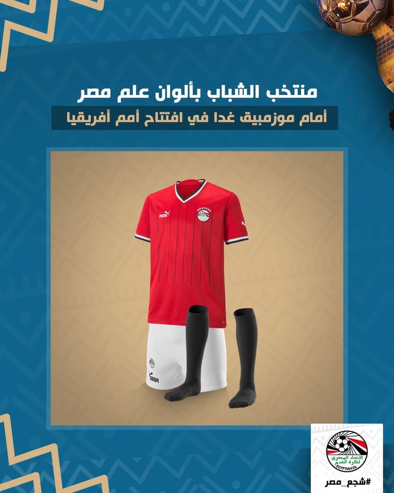 منتخب الشباب، أسفر الاجتماع الفني الخاص بمباراة منتخب مصر للشباب مواليد 2003 أمام موزمبيق باستاد القاهرة الدولي، عن ارتداء منتخب مصر القميص الأحمر والشورت الأبيض والجوارب السوداء ويرتدي حارس المرمى الزي الأخضر الكامل، بينما يظهر منتخب موزمبيق بالزي الأصفر الكامل ويرتدي حارسه اللون البرتقالي.