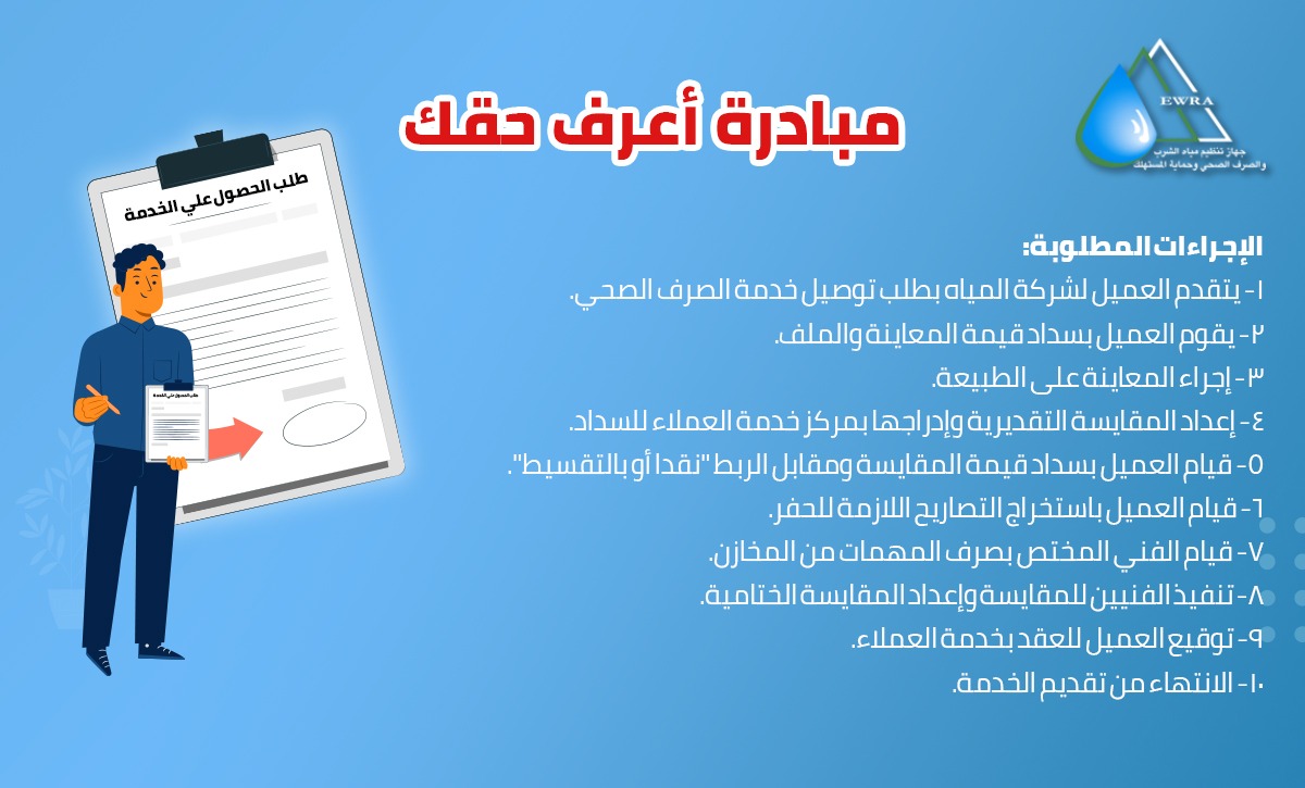 نشر الجهاز التنظيمي لمياه الشرب والصرف الصحى وحماية المستهلك، عبر موقعه الإلكتروني، وصفحته الرسمية على الفيس بوك، إنفوجرافا، يوضح للمواطنين المستندات والإجراءات المطلوبة لتوصيل خدمة الصرف الصحي للأنشطة غير المنزلية (الأنشطة الأخرى)، وذلك في إطار مبادرة "أعرف حقك" التي أطلقها الجهاز التنظيمي، وتهدف لنشر المعلومات الهامة لتعريف المواطنين بحقوقهم وواجباتهم.