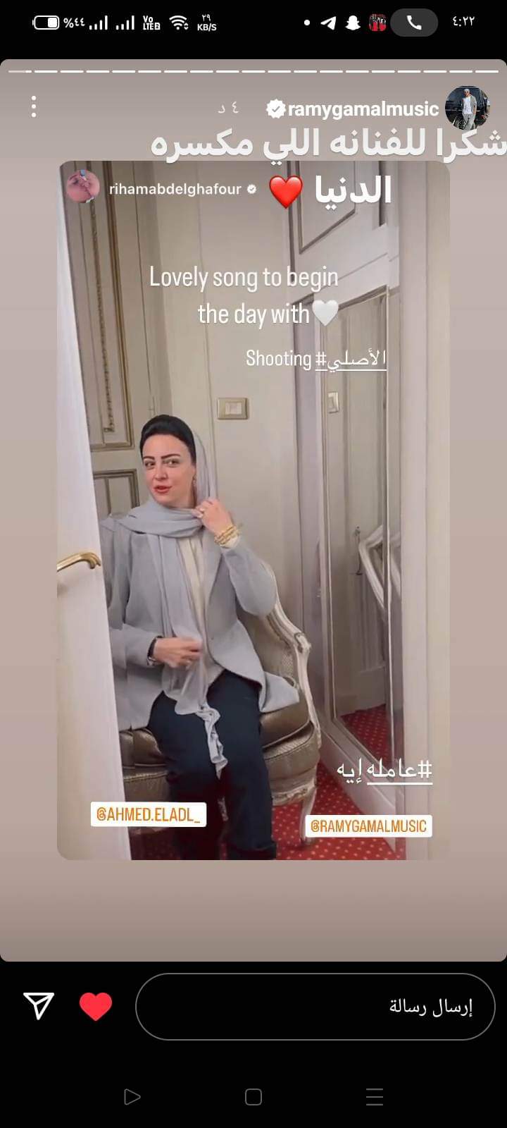 وأعاد رامي جمال نشر الفيديو الذي نشرته ريهام عبد الغفور في كواليس مسلسلها الجديد “الأصلي”، وهي تغني أغنيته “عاملة إيه” عبر “إنستجرام”.