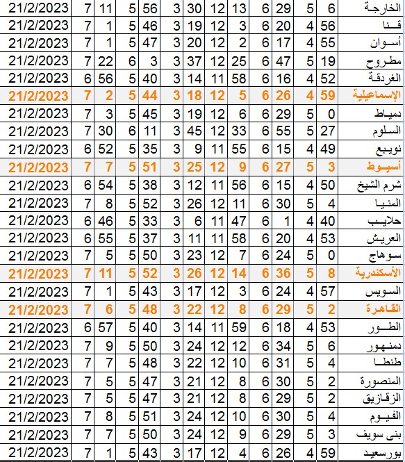 مواقيت الصلاة اليوم وفقًا للتوقيت المحلي لمدينتي القاهرة والإسكندرية وعدد من مدن ومحافظات الجمهورية من واقع بيانات الهيئة العامة للمساحة