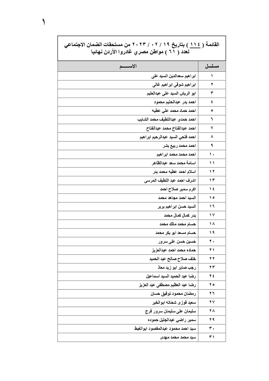 وأضاف الملحق العمالي أنه طبقا لإجراءات المؤسسة العامة للضمان الاجتماعي بالأردن، سيتم استرجاع المبالغ غير المصروفة بعد مرور 50 يومًا من تاريخ الإعلان عن تحويل المستحقات، مشيرًا إلى أنه يتم بشكل مستمر التنسيق والتجهيز لإرسال باقي الدفعات لمستحقيها تباعًا، فور تدقيقها من الجهات المعنية حفاظا على حقوق المواطنين المستحقين لهذه الدفعات، وتضم القائمة الجديدة الأسماء المرفقة مع هذا البيان: